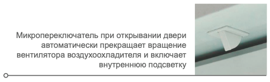 - Микропереключатель отключает вентилятор и включает подсветку при открывании двери.