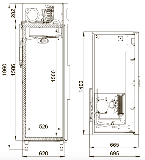 Профессиональный холодильный шкаф POLAIR CM110-G с корпусом из нержавеющей стали и верхним агрегатом, серии Standard для школ, детских садов, кафе, ресторанов, столовых и других предприятий общественного питания. Объем 1000 литров. Динамическое охлаждение. Автоматическая оттайка. Размер полок 595x455 мм. Одна камера, две распашные двери. Стандартное управление. Температура: 0…+6°C. Хладагент R290 пропан.