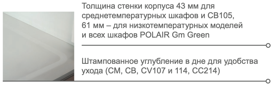 Шкафы среднетемпературные POLAIR CB107-Gm имеют цельнозаливной герметичный корпус с термоизоляцией из пенополиуретана. Обшивка корпуса внутри и снаружи (кроме задней внешней стенки) выполнена из качественной нержавеющей стали. Профили дверей и верхней панели изготавливаются из алюминия, что придает шкафам премиальный внешний вид. Холодильные шкафы Grande-m рассчитаны на работу при температуре окружающей среды до +40°С и относительной влажности воздуха до 80%. Направляющие стандарта Gastronorm позволяют использовать вместо полок гастроемкости размера GN2/1 (650x530 мм).