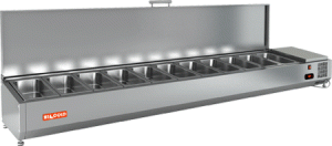 Витрина настольная гастронормированная. Предназанчена для хранения ингредиентов. Крышка из нержавеющей стали. Вместимость GN: 11х1/3, - глубина 150мм. Гастроемкости в комплект не входят.