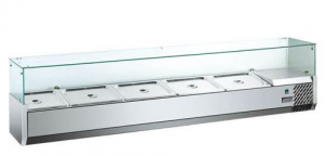 Продукты раскладываются в охлаждаемые емкости (стандарта gastronorm) и при необходимости накрываются крышками. Фронтальное стекло и стеклянная полка позволяют демонстрировать гостям содержимое витрины и предлагать начинки на выбор. Конструкция витрины позволяет устанавливать ее на П-образный борт столов для пиццы с каменной столешницей.