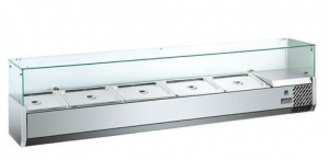Витрина Hurakan HKN-VRX1500/380 настольная холодильная для кафе, ресторанов, столовых, закусочных и других предприятий общественного питания и торговли. Основное назначение - для начинок и ингредиентов. Размеры: 1500x395x435 мм. Вместимость: 6 х GN 1/3. Температура: +2…+8°C.