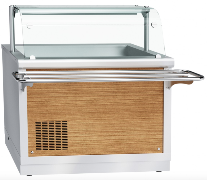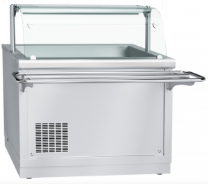Элемент линии раздачи Abat Hot-Line. Охлаждаемый прилавок Abat ПВВ(Н)-70Х-НШ с ванной для установки гастроемкостей стандарта GN. Оборудован нейтральным шкафом, регулируемыми ножками, 1 полкой, LED подсветкой, и гнутым защитным стеклом со стороны потребителей.