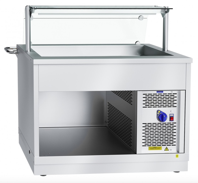 Abat ПВВ(Н)-70Х-НШ нерж (21000002732) прилавок открытый холодильный для холодных блюд с охлаждаемой ванной под гастроемкости (GN). Элемент линии раздачи Абат Hot-Line. Предназначен для раздачи и хранения третьих блюд и напитков. Габариты: 1120х717(1016)х869(1217) мм, нейтральный шкаф, защитное стекло, 1 полка, LED подсветка. Цвет: нержавеющая сталь. Опция: декоративные фронтальные панели, колеса.