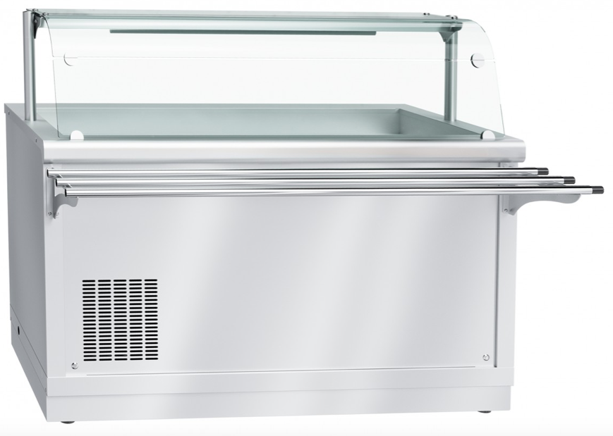 Элемент линии раздачи Abat Hot-Line. Охлаждаемый прилавок Abat ПВВ(Н)-70Х-01-НШ с ванной для установки гастроемкостей стандарта GN. Оборудован нейтральным шкафом, регулируемыми ножками, 1 полкой, LED подсветкой, и гнутым защитным стеклом со стороны потребителей.