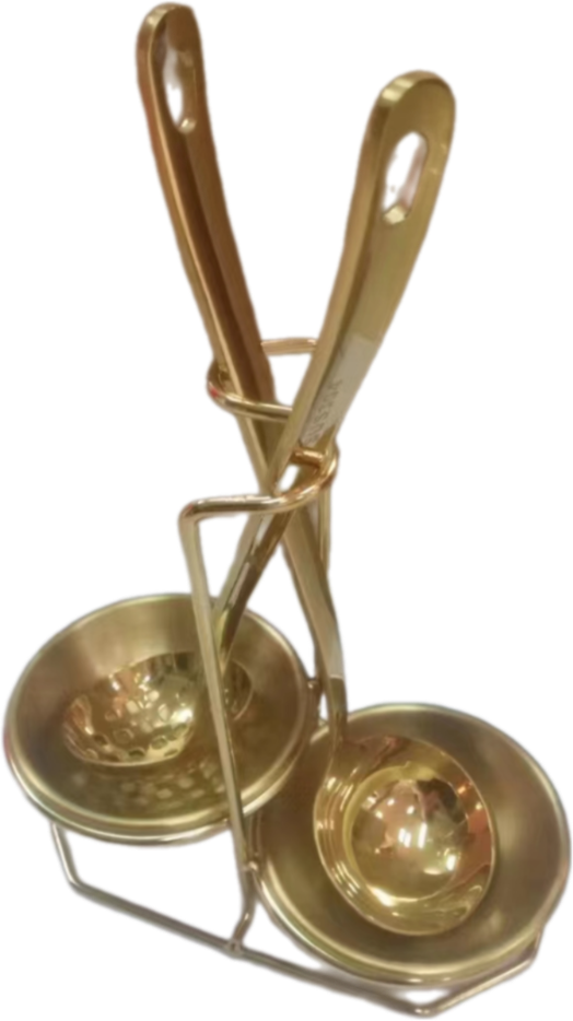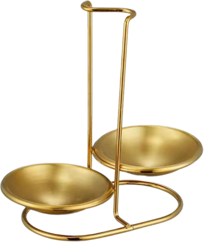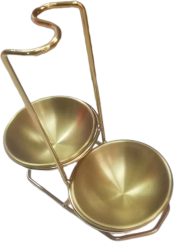 Подставка для половника и шумовки Crazy Pan CP‑STAND‑G - функциональный аксессуар для профессиональных кухонь и линий раздачи, предназначенный для удобного и гигиеничного хранения кухонных инструментов. Материал нержавеющая сталь. Высота 21см. Ширина 21 см. Диаметр одной чаши 11см. Цвет Золото