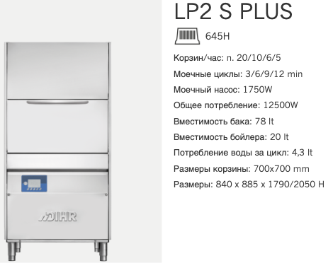Страна Италия Кол-во режимов 4 Замачивание / предв. мойка нет Напряжение, В. 380 Мощность, кВт/ч. 15,5 Назначение котломоечная Продолжительность цикла, сек. 180/360/540/720 Температура воды подключения холодная Рекуператор (теплообменник) нет В наличии Нет Модель LP2 S Plus DD+DP+EP Серия LP Длина, мм 840 Ширина, мм 885 Высота, мм. 1790 Управление электронное Артикул пр-ля LP2 S Plus DD+DP+EP Тип фронтальные Температура ополаскивания, °C 85 Стандарт кассет, мм 700x700 Дозатор ополаск. средства есть Кол-во кассет в час, макс. 20 Объем бойлера, л. 20 Полезная высота, мм 645 Дозатор моющего средства есть Высота с поднятым капотом, мм 2050 Температура мойки, °C 55 Водоумягчитель опция Наличие помпы (сливной насос) есть Расположение панели управления фронтальное нижнее Сушильный модуль нет Объем бака, л. 78 Расход воды, л./цикл 4,3 Мощность бойлера, кВт/ч. 9 Мощность бака, кВт/ч. 6 Обзорное окно нет Кол-во кассет за 1 загрузку 1 -