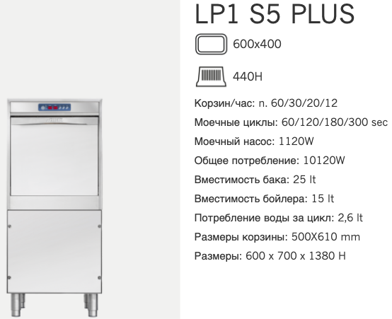 Страна Италия Кол-во режимов 4 Замачивание / предв. мойка нет Напряжение, В. 380 Мощность, кВт/ч. 10,2 Назначение котломоечная Продолжительность цикла, сек. 60/120/180/300 Температура воды подключения горячая Рекуператор (теплообменник) нет В наличии Нет Модель LP1 S5 Plus DD+DP Серия LP Длина, мм 600 Ширина, мм 700 Высота, мм. 1380 Управление электронное Артикул пр-ля LP1 S5 Plus DD+DP Тип фронтальные Температура ополаскивания, °C 85 Стандарт кассет, мм 500x610 Дозатор ополаск. средства есть Кол-во кассет в час, макс. 60 Объем бойлера, л. 15 Полезная высота, мм 440 Дозатор моющего средства есть Высота с поднятым капотом, мм 2275 Температура мойки, °C 55 Водоумягчитель опция Наличие помпы (сливной насос) есть Расположение панели управления фронтальное нижнее Сушильный модуль нет Объем бака, л. 25 Расход воды, л./цикл 2,6 Обзорное окно нет Кол-во кассет за 1 загрузку 1 -