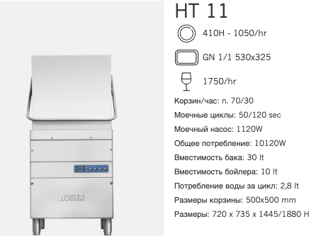Профессиональная посудомоечная машина купольного типа Dihr HT 11 DD+EP (HT 11 DDE+XP) для баров, кафе, ресторанов, столовых, фабрик-кухонь и других предприятий общественного питания и пищевых производств. Используется для мойки столовой посуды, приборов, подносов, гастроемкостей и не крупного кухонного инвентаря. Ручной подъем купола, два дозатора, дополнительная мощность для подключения к холодной воде.