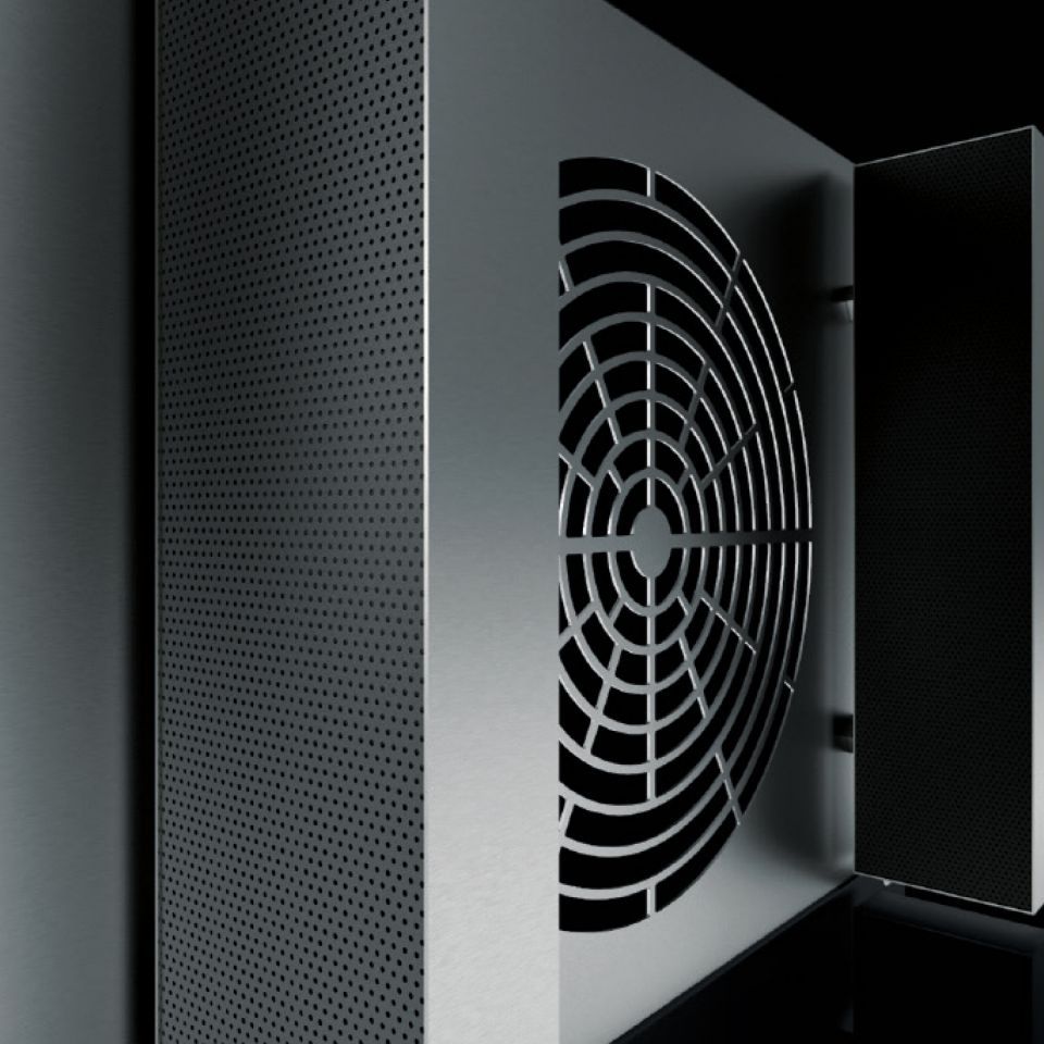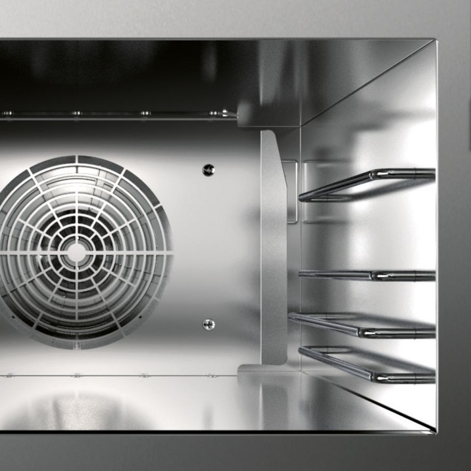 - Высокоэффективный реверсивный вентилятор равномерно распределяют воздух по всем противням. Передний кольцевой элемент дополнительно увеличивает потоки воздуха для более быстрого и эффективного приготовления.