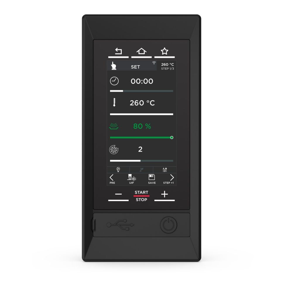 Панель управления предлагает работы на двух интерфейсах (Bake или Speed), в зависимости от текущей задачи. Работа может производиться в ручном или автоматических режимах. Память аппарата позволяет сохранить до 386 программ приготовления по 9 шагов приготовления в каждой.