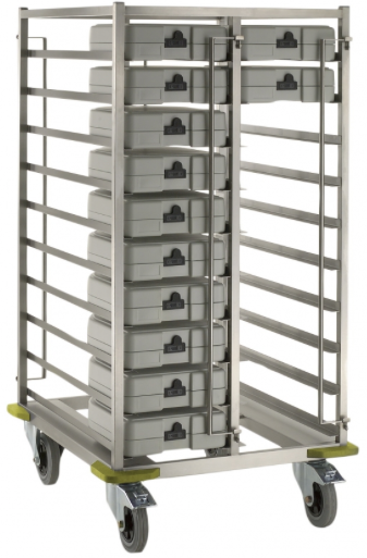 Тележка на 48 термобоксов MenüMobil Universal MTUN48 - изготовлена из нержавеющей стали 18/10. Внешние габариты тележки: 1132х867х1675 (+40 мм, если опция колеса 200 мм) мм, открытая версия, 4 защитных полимерных бампера на нижней раме, 4 вращающихся колеса Ø 200 мм (2 из которых с тормозов). Каркас из труб квадратного сечения: 25х25 мм. Для транспортировки 40 термобоксов MenüMobil Universal. 10 уровней (40 пар Г-образных направляющих) по 4 термобокса, загрузка с 2 сторон, 4 ограничителя для фиксации термобоксов (по 2 с каждый стороны). Нагрузка на тележку до 405 кг. Вертикальное расстояние между Г-образными направляющими: 115 мм. Горизонтальное расстояние между Г-образными направляющими: 370 мм. В комплекте съемная рабочая поверхность.