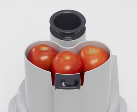 - Насадка овощерезка с большой воронкой (площадью 87см?) для нарезки объемных овощей, таких как капуста, лук или помидоры и круглой воронкой (? 58 мм) для шинковки длинных продуктов, например огурцов или сельдерея.
