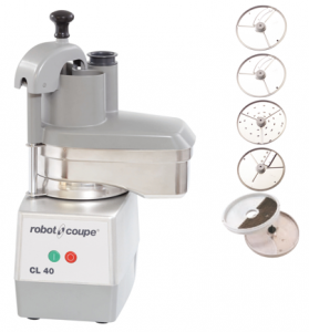 Профессиональная электрическая овощерезка Robot Coupe CL40 6 дисков (2203) предназначена для нарезки овощей, фруктов грибов и других продуктов на предприятиях общественного питания и торговли. Рассчитана для небольших заведений. Крышка с большим D-образным и круглым загрузочными отверстиями. Поставляется с 6 дисками (комплект 1945): Слайсер 2 мм, Слайсер 4 мм, Терка 2 мм, Соломка 4х4 мм, Комплект для кубиков 10х10х10 мм.
