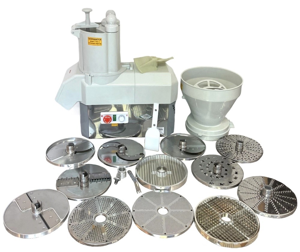 Протирочно-резательная машина Торгмаш МПР-350М для использования на профессиональных кухнях в ресторанах, столовых и других предприятиях общественного питания. Машина предназначена для протирки вареных продуктов (картофеля, свеклы, моркови, жидких каш, гороха, фасоли, яблок, творога и других продуктов), нарезки сырых или вареных овощей и фруктов (картофеля, свеклы, моркови, лука, репы, брюквы, огурцов, томатов и т.д.), а также тонкого измельчения измельчения картофеля, моркови, и шинковки капусты. Способы переработки продуктов: 11 видов нарезки (9 режущих дисков и 3 решетки), 2 вида протирки. Диски входят в комплект поставки.