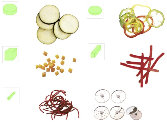 - Комплект из 6 дисков (арт. 1945): Слайсер 2 мм, Слайсер 4 мм, Терка 2 мм, Соломка 4х4 мм, Комплект для кубиков 10х10х10 мм
