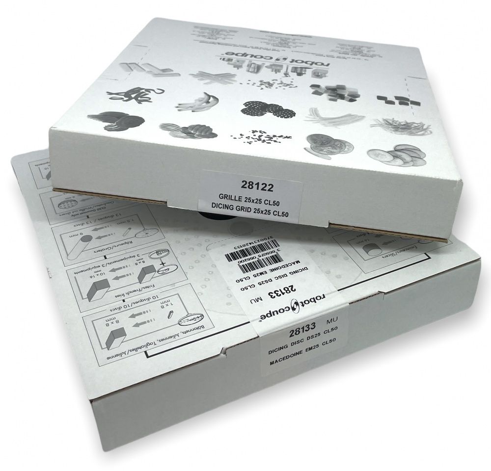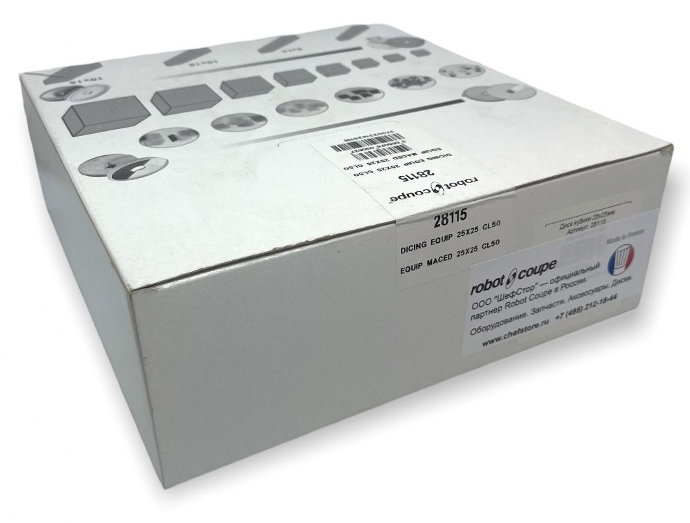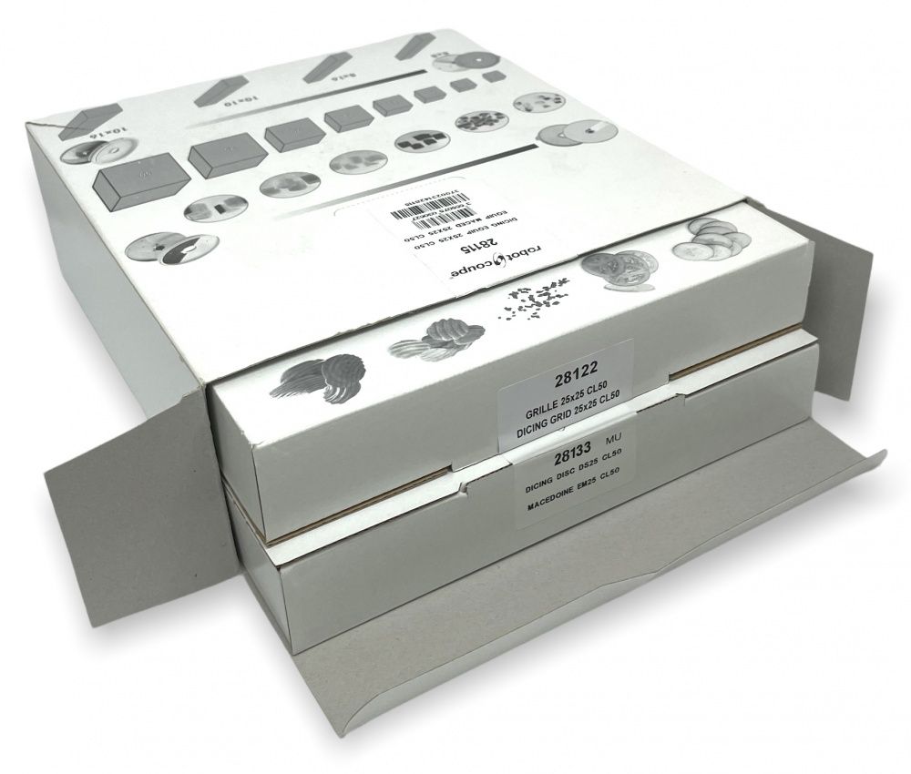 Комплект кубики 25х25х25 Robot Coupe 28115 для профессиональных овощерезок и кухонных процессоров Robot Coupe. Описание комплекта Robot Coupe 28115Комплект кубики 25х25х25 Robot Coupe 28115 используется с профессиональными овощерезками на предприятиях общественного питания и пищевых производствах для нарезки различных пищевых продуктов, кубиками размером 25х25х25 мм. Нарезанные продукты используются для приготовления различных блюд. В комплект для кубиков 28115 входят два диска из нержавеющей стали: - Диск решетка для кубиков 25х25 мм, арт. 28122.