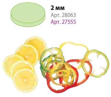 Диск слайсер 2мм Robot Coupe 27555 используется для стандартной нарезки ломтиком, шинковки различных мягких и твердых овощей и фруктов. Диск отлично нарезает идеальные кружочки и кольца, часто используется для нарезки лимонов, перцев, батата, лука-порея и т.д. Изготовлен из нержавеющей стали.