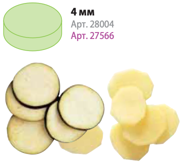 Диск слайсер 4мм Robot Coupe 28004W для обычной нарезки. Обозначение на диске E/S 4. Старый артикул 28004. Диск 28004W изготовлен из стали с покрытием Mineral+. Это специальное покрытие на минеральной основе обеспечивающее дополнительную защиту поверхности диска, а также снижающее силу трения продукта о поверхность диска и обеспечивающее высокую точность и качество нарезки с сохранением свежести продуктов. Описание диска Robot Coupe 28004WДиск слайсер 4мм Robot Coupe 28004W используется для стандартной нарезки ломтиком, шинковки различных мягких и твердых овощей и фруктов. Он легко нарежет идеальными кружочками, например баклажаны, картофель, лимон, перец, лук-порей, батат и др. Изготовлен из нержавеющей стали. Внимание! Обозначение E/S 4 на диске не является артикулом, а только обозначает тип и толщину нарезки. Данное обозначение может встречаться на дисках Robot Coupe от разных моделей овощерезок. Во избежание ошибки используйте для подбора дисков каталог продукции или проконсультируйтесь у наших менеджеров: 8 (495) 212-18-44. Для продления срока эксплуатации дисков требуется их правильная мойка и хранение. Не допускается хранение режущих дисков навалом, так как это приводит к ухудшению заточки, деформации самих дисков и режущих лезвий. Рекомендуем использовать для хранения дисков специальные аксессуары: настенные полки, модульные держатели и защитные крышки. Использование данных аксессуаров поможет оптимизировать рабочее пространство и продлит срок эксплуатации дисков. Совместимые с диском Robot Coupe 28004W аппараты- Овощерезки Robot Coupe серий: CL50, CL 50 Ultra, CL 50 Gourmet, CL52, CL55 и CL60.