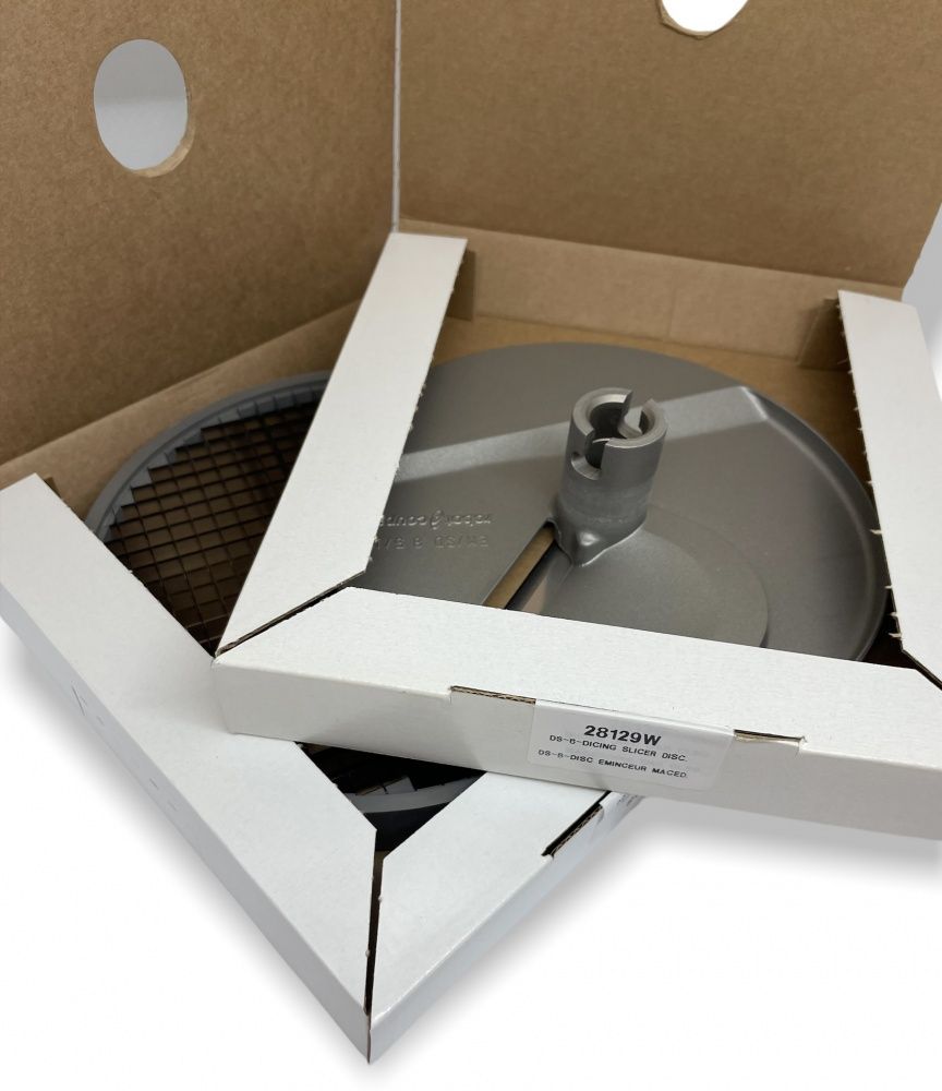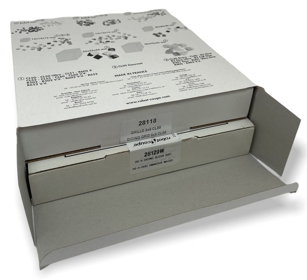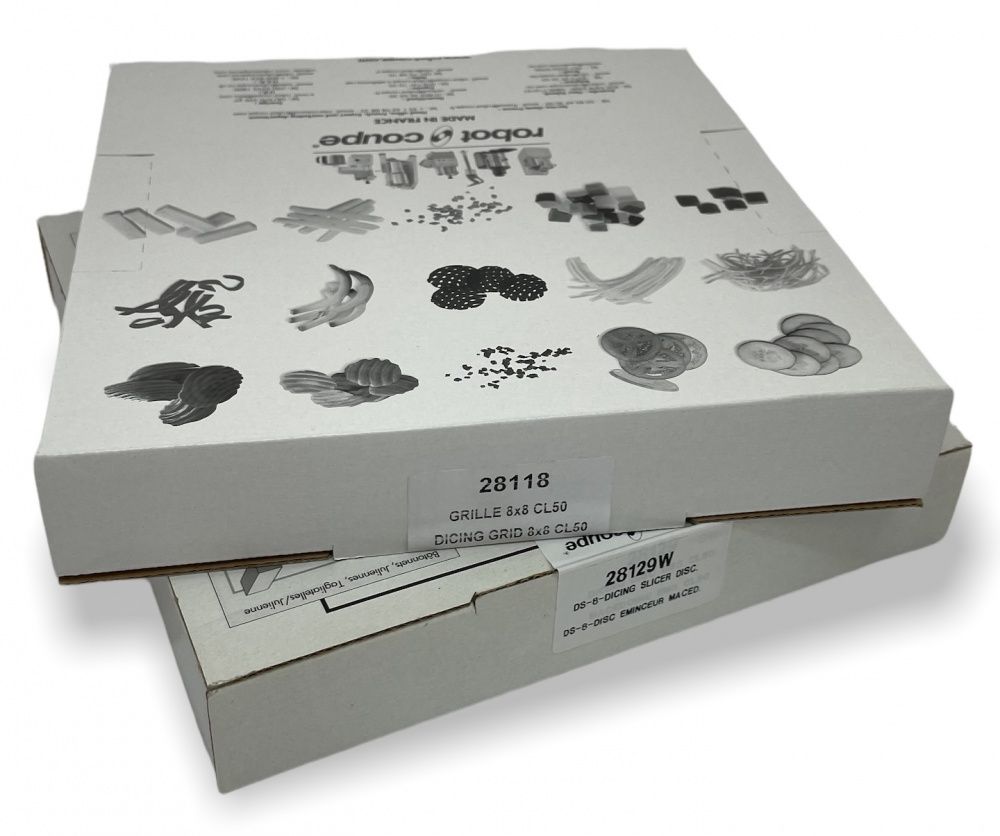 Комплект кубики 8х8х8 Robot Coupe 28111 для профессиональных овощерезок и кухонных процессоров Robot Coupe. Описание комплекта Robot Coupe 28111Комплект кубики 8х8х8 Robot Coupe 28111 используется с профессиональными овощерезками на предприятиях общественного питания и пищевых производствах для нарезки различных пищевых продуктов, кубиками размером 8х8х8 мм. Нарезанные продукты используются для приготовления различных блюд. В комплект для кубиков 28111 входят два диска из нержавеющей стали: - Диск решетка для кубиков 8х8 мм, арт. 28118.