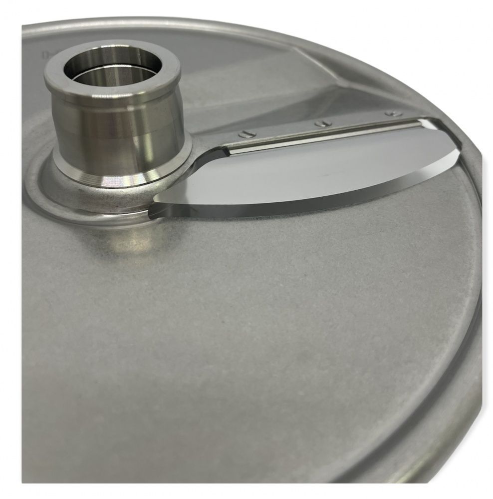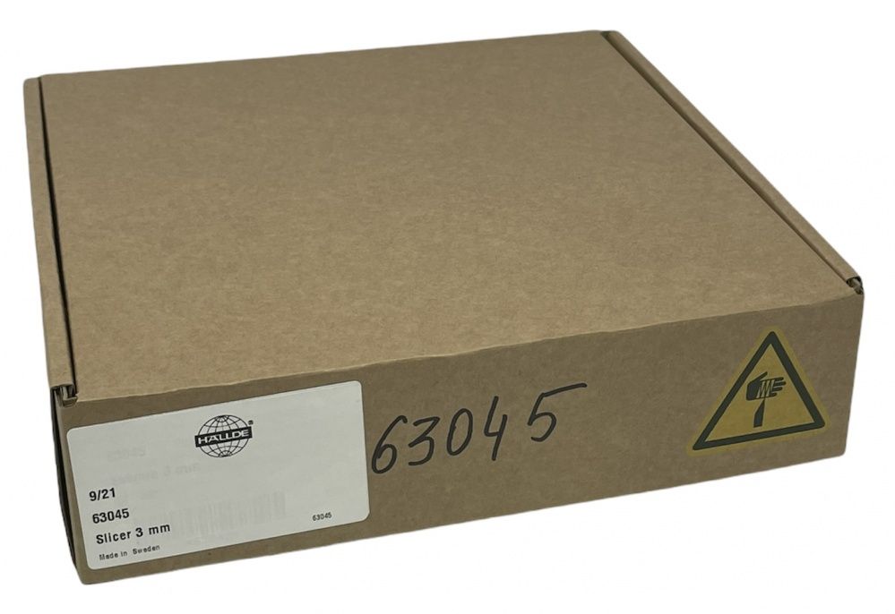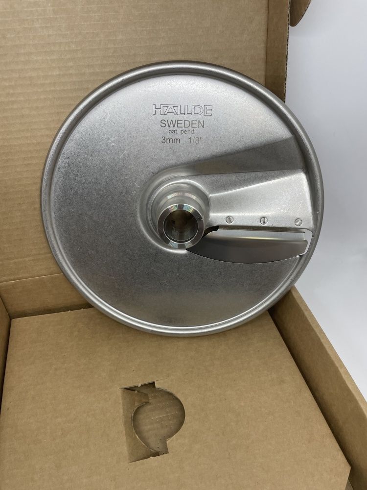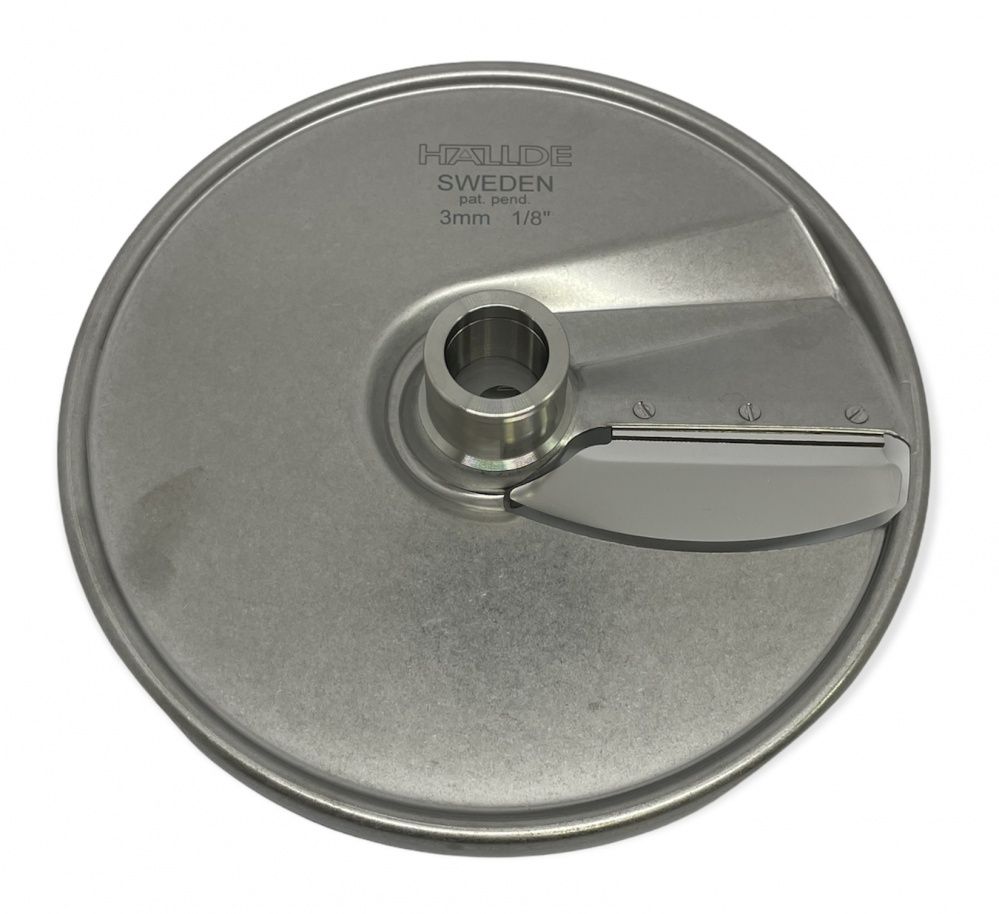 Диск ломтик Hallde 63045 с толщиной нарезки 3 мм, для шинковки, нарезки ломтиком и нарезки кубиком (требуется дополнительный решетчатый диск) различных продуктов в кафе, ресторанах и других предприятиях общественного питания. Диск 63045 подходит только для самых производительных моделей профессиональных овощерезок Hallde RG-300i, RG-350, RG-400, RG-400i.