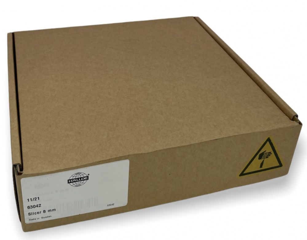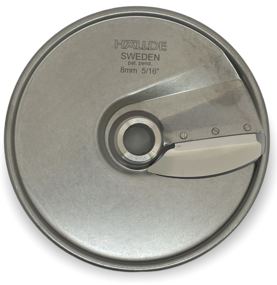 Диск ломтик Hallde 63042 с толщиной нарезки 8 мм, для шинковки, нарезки ломтиком и нарезки кубиком (требуется дополнительный решетчатый диск) различных продуктов в кафе, ресторанах и других предприятиях общественного питания. Диск 63042 подходит только для самых производительных моделей профессиональных овощерезок Hallde RG-300i, RG-350, RG-400, RG-400i.