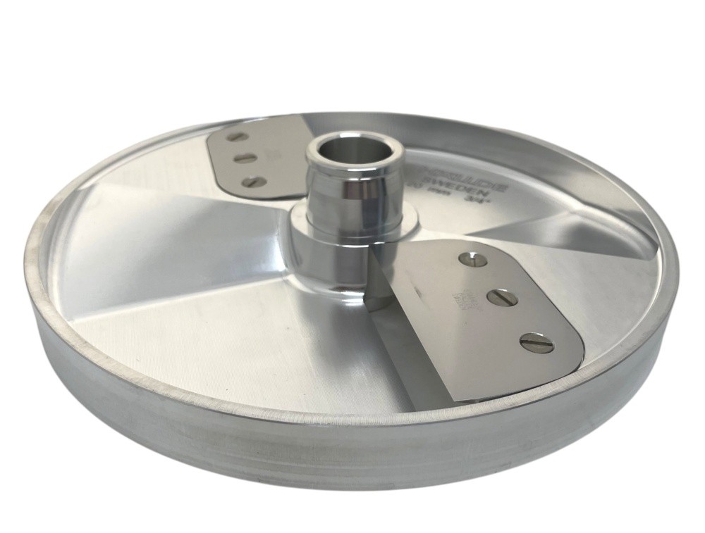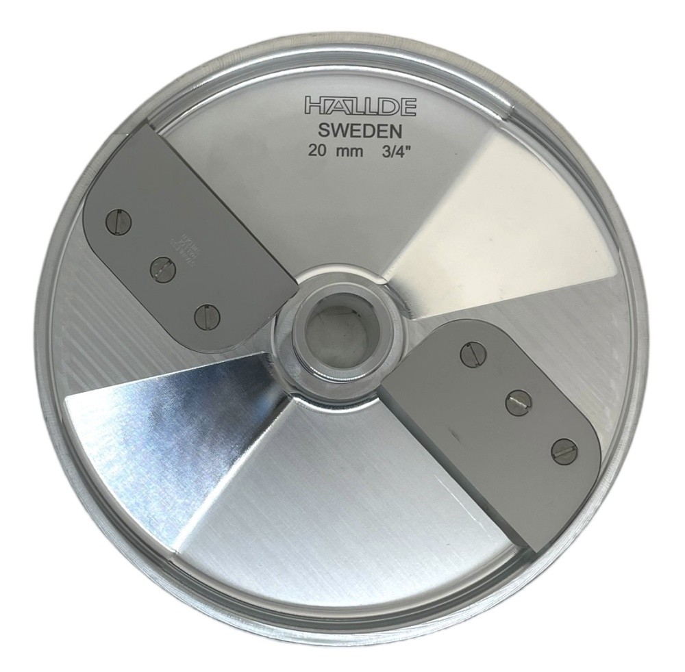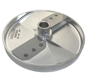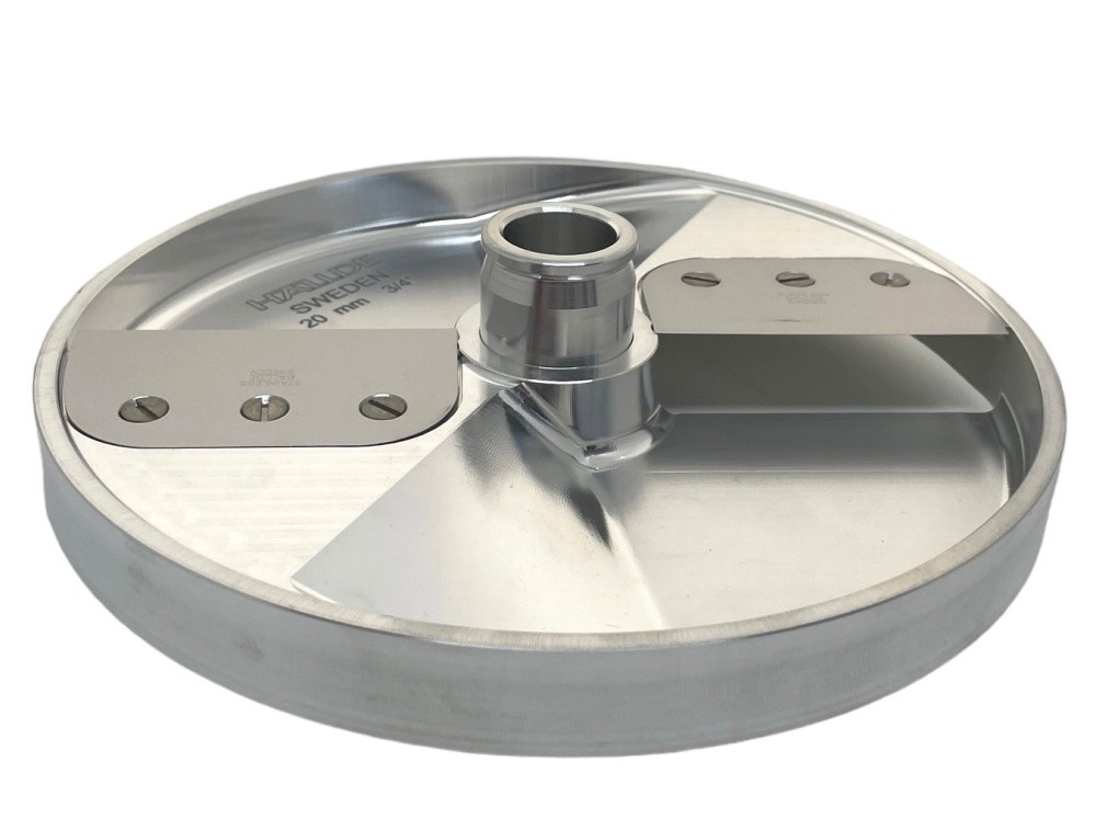 Диск ВП ломтик Hallde 65024 с толщиной нарезки 20 мм и двумя прямыми лезвиями, для шинковки, нарезки ломтиком и кубиком различных продуктов в кафе, ресторанах и других предприятиях общественного питания. Диск 65024 подходит только для самых производительных моделей профессиональных овощерезок Hallde RG-300i, RG-350, RG-400, RG-400i.