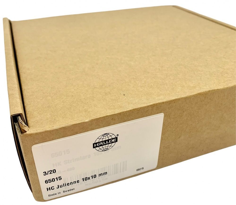 Диск ВП соломка Hallde 65015 для нарезки соломкой размером 10х10 мм различных продуктов в кафе, ресторанах и других предприятиях общественного питания. Диск Hallde 65015 используется только с профессиональными овощерезками Hallde RG-300i, RG-350, RG-400, RG-400i.
