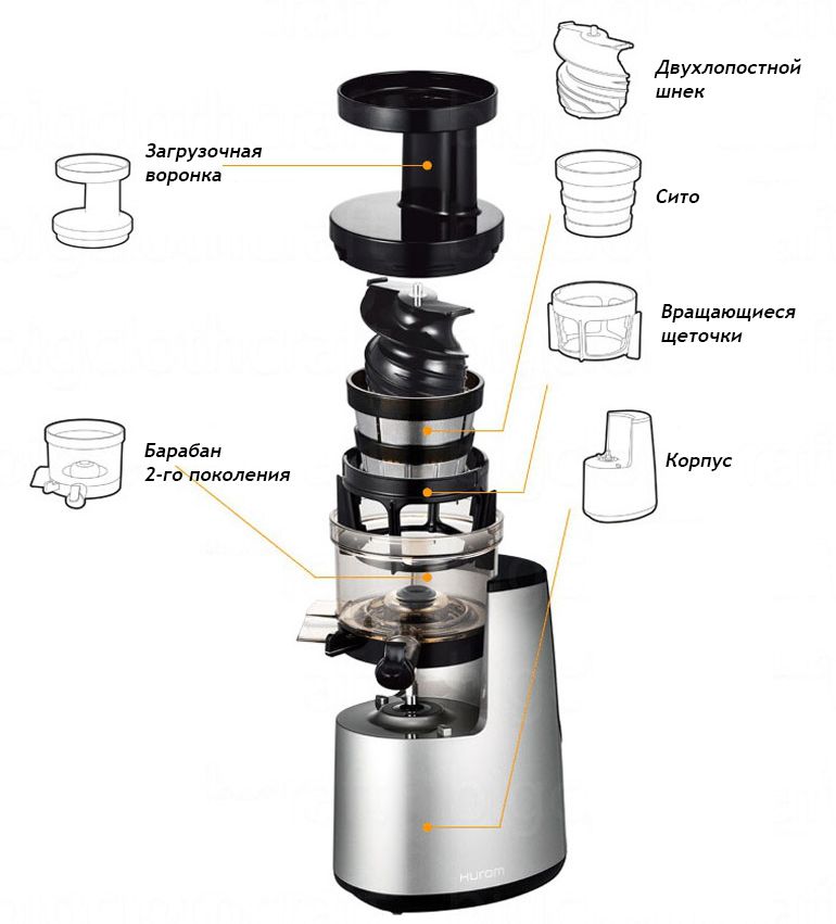 Вращаясь на скорости всего около 40 оборотов в минуту шнек соковыжималки Hurom аккуратно, быстро и нежно выдавливает сок из фруктов и овощей без нагрева, не разрушая содержащиеся в нем витамины.Механизм отжима прост, гениален и поэтому столь эффективен - шнек, сеточка, щеточки-сокосъемники. Каждая деталь вставляется друг в друга и готово. Просто и быстро - Ваша соковыжималка готова к приготовлению свежего и невероятно вкусного сока.