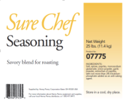 Приправа для курицы Henny Penny 07775 Sure Chef. Разработана приправа для готовки кур в ротационных конвейерных печах Henny Penny, а так же для готовки во фритюрнице, работающей под давлением. Состав: Соль; Специи; Паприка; Глутамат натрия; Луковый порошок; Экстракт паприки; Трикальцийфосфат (<2%).