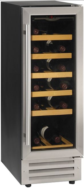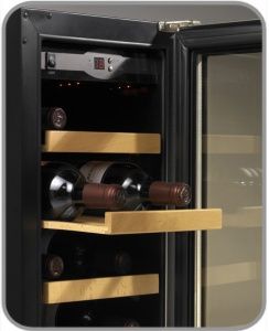 Стеклянная тонированная перенавешиваемая дверь с рамой и ручкой из нержавеющей стали, электронный контроллер, термометр, 6 деревянных выдвигающихся полок, 2 ролика и 2 регулируемые по высоте ножки, охлаждение с помощью вентилятора, функция автоматического размораживания, LED-подсветка, угольный фильтр.