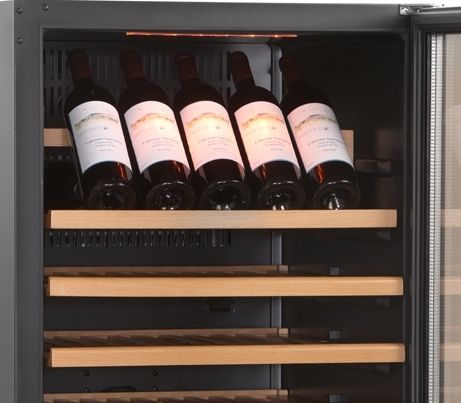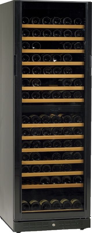 Шкаф холодильный для вина комбинированный (2 температурные зоны) со стеклянной тонированной перенавешиваемой дверью имеет электронный контроллер, термометр, встроенную ручку, 15 деревянных выдвигающихся полок, замок, 2 ролика и 2 регулируемые по высоте ножки, охлаждение с помощью вентилятора, функцию автоматического размораживания, LED-подсветку, угольный фильтр.
