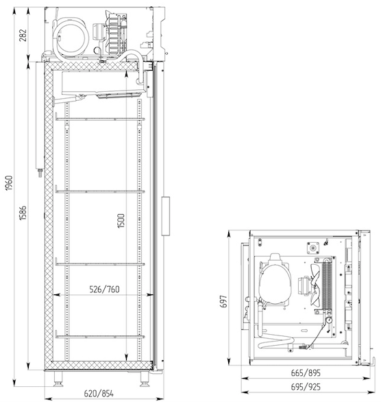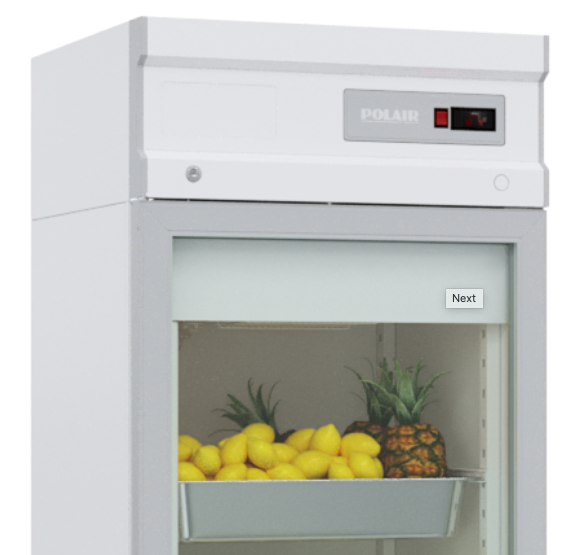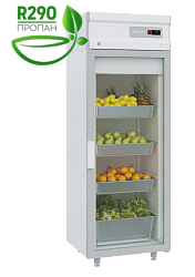 Холодильник односекционный со стеклянной дверью POLAIR DM107-S без канапе (артикул 1002510d) для кафе, ресторанов, кулинарий, АЗС и пр. Предназначен для хранения и демонстрации продуктов и напитков. Цельнозаливной корпус с полимерным покрытием, температурный режим +1°С до +10°С, динамическое охлаждение, объем 700 л, 4 полки (с нагрузкой на каждую до 40 кг, с возможностью установки дополнительных), направляющие GN2/1 (650х530мм), электронное управление, верхний агрегат с ж/к дисплеем, возможность изменения стороны открывания двери, автоматическая оттайка с испарением конденсата, хладагент R290.