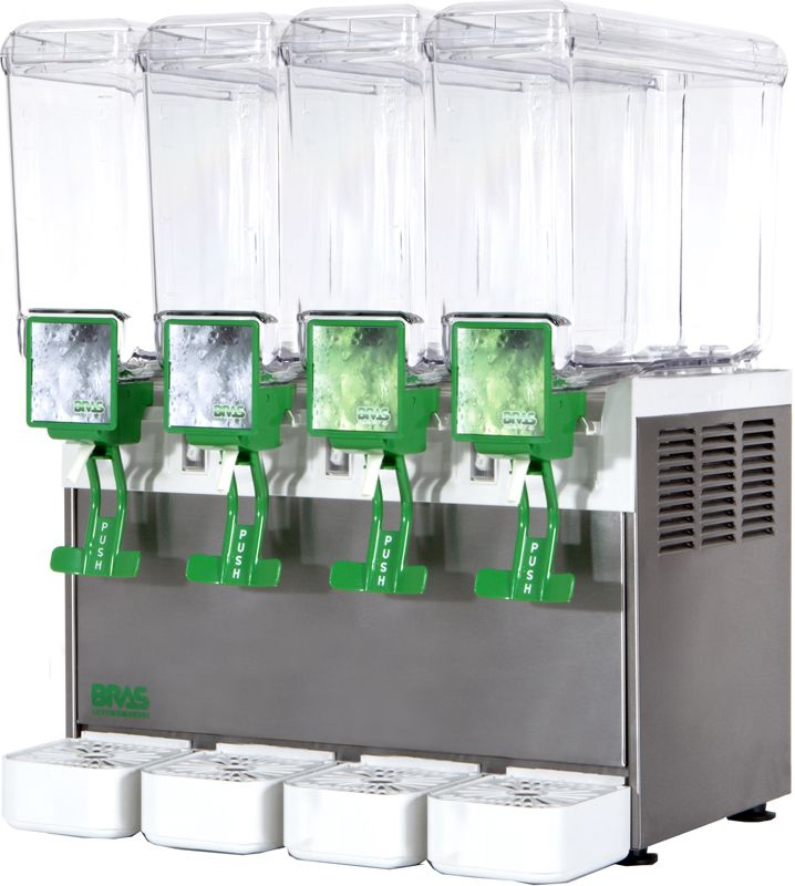 Сокоохладитель предназначен для охлаждения осветленных соков. Аппарат представляет собой специальный кожух с холодильным мини-агрегатом в нижней части, а в верхней части располагаются 4 ванны объемом 4х5 л, выполненные из прозрачного пищевого пластика. Модель при комнатной температуре за 15 - 18 минут охлаждает сок до +10/+15С.