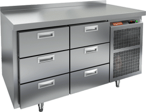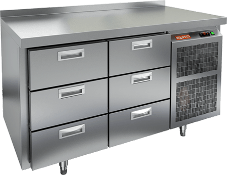 Холодильный стол SN 33/BT, это шкаф с охлаждаемым внутренним объемом и расположенной над шкафом рабочей поверхностью (столешницей). Равномерное охлаждения продуктов внутри шкафа обеспечивается принудительной циркуляцией воздуха при помощи встроенных вентиляторов. Оборудование, выполненное полностью из высококачественной нержавеющей стали с бортом, 4 регулируемые по высоте ножки от 110мм до 190мм, шесть выдвижных ящиков. Динамическая система охлаждения, электронный блок управления температурным режимом, автоматический режим оттайки испарителя.