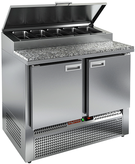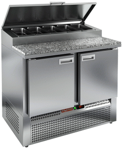 В столешнице предусмотрено размещение гастроемкостей для ингредиентов. Охлаждаемый объем. Внутри установлены полки-решетки. Пространство между внутренней и наружной стенкой заполнено пеной-теплоизолятором. Для обеспечения плотности прилегания дверей стола к корпусу - используется уплотнитель с магнитной вставкой. Цельнозаливной корпус. Электронный блок управления. Автоматическая оттайка.