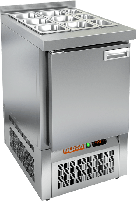 Стол холодильный среднетемпературный, гастронормированный GN1/1 для салатов и ингредиентов, с бортом, выполнен из нержавеющей стали. Модель совмещает в себе охлаждаемый объем и рабочую поверхность, что значительно упрощает работу повара, так как все необходимые компоненты находятся под рукой. В столешнице предусмотрено гнездо для установки гастроемкости GN1/1 (гастроемкость в комплект не входит), без крышки. Стол имеет 1 глухую, распашную дверь, нагрузка на полку до 50кг, нижнее расположение агрегата, 4 регулируемые по высоте ножки, динамическую систему охлаждения, электронный контроль температуры, автоматический режим оттайки испарителя. Эксплуатация при температуре окружающей среды до + 43 °С. Петля-доводчик двери позволяет при открытии двери на 180° по отношению к столу беспрепятственно вести загрузку стола продуктом, и при обычном открытии двери доводчик сам закрывает дверь и плотно прижимает ее к корпусу стола.