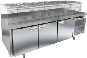 Охлаждаемый объем. Внутри установлены полки-решетки. Пространство между внутренней и наружной стенкой заполнено пеной-теплоизолятором. Для обеспечения плотности прилегания дверей стола к корпусу - используется уплотнитель с магнитной вставкой. Цельнозаливной корпус. Электронный блок управления. Автоматическая оттайка.
