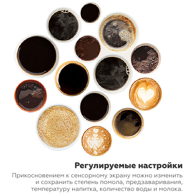 - настраивать крепость, объём кофе и воды, температуру, плотность пены, время предварительного смачивания