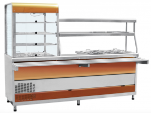 Мини-линия раздачи Abat ПВХМ-70КМУ красное золото (21000802011) с левой витриной, это комплексное решение в миниатюре, сочетающее в себе сразу три элемента: холодильную витрину, мармит первых блюд и мармит вторых блюд.