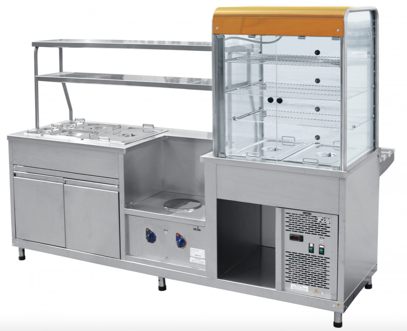 Мини-линия раздачи Aba ПВХМ-70КМУ, это отличное комплексное решение для предприятий с небольшой проходимостью и небольшим ассортиментом блюд. Общая длина чуть более 2-х метров, позволяет разместить мини-линию практически на любой площади, а встроенные модули обеспечивают необходимы функционал. Внизу прилавка расположен нейтральный шкаф для хранения инвентаря. Двойная полка с подсветкой над мармитом обеспечивает большую полезную площадь для выкладки блюд.