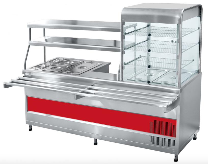 Мини-линия раздачи Abat ПВХМ-70КМУ нерж (21000802019) с правой витриной, это комплексное решение в миниатюре, сочетающее в себе сразу три элемента: холодильную витрину, мармит первых блюд и мармит вторых блюд.