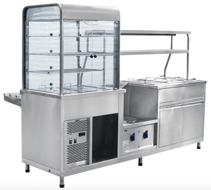 Мини-линия раздачи Aba ПВХМ-70КМУ, это отличное комплексное решение для предприятий с небольшой проходимостью и небольшим ассортиментом блюд. Общая длина чуть более 2-х метров, позволяет разместить мини-линию практически на любой площади, а встроенные модули обеспечивают необходимы функционал. Внизу прилавка расположен нейтральный шкаф для хранения инвентаря. Двойная полка с подсветкой над мармитом обеспечивает большую полезную площадь для выкладки блюд.