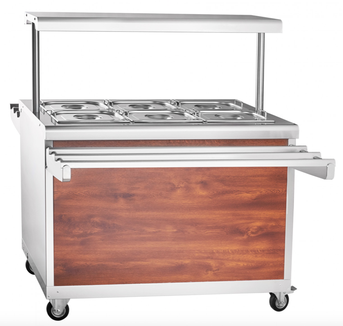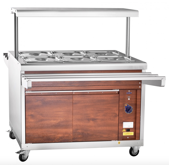 Abat ЭМК-70ПМ (дуб) (21001805756) мармит вторых блюд паровой для гастроемкостей (GN). Элемент линии раздачи Abat Передвижная. Габаритные размеры: 1120x720(1371)x1341 мм, подсветка, шкаф. Отделка: декоративная "дуб".