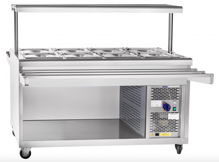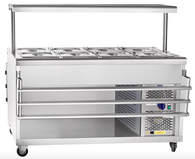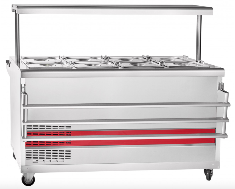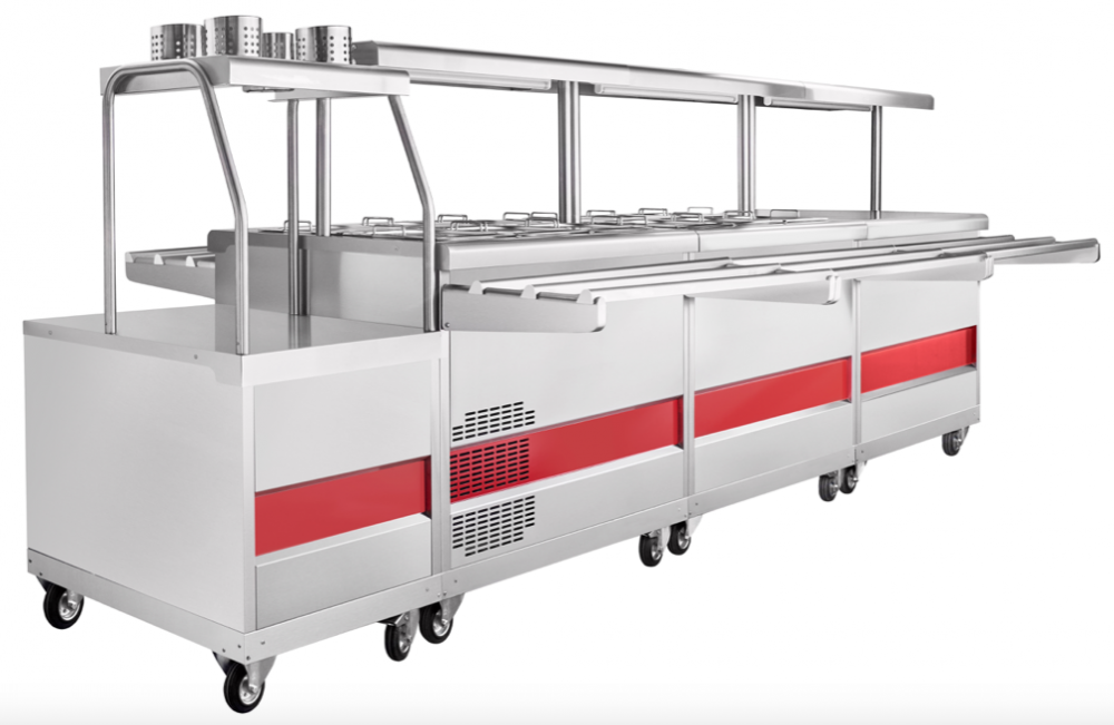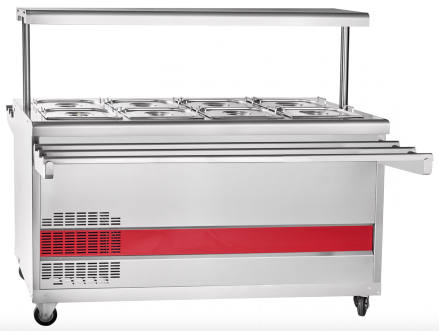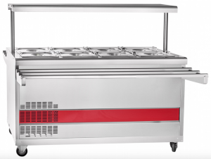 Прилавок открытый холодильный передвижной блюд Abat ПВВ(Н)-70ПМ-01-НШ (нерж) (21000000454) с охлаждаемой ванной. Предназначен для раздачи и хранения третьих блюд и охлажденных напитков в ресторанах и столовых работающих по системе самообслуживания, отдельно или в составе линии раздачи блюд Abat Передвижная.