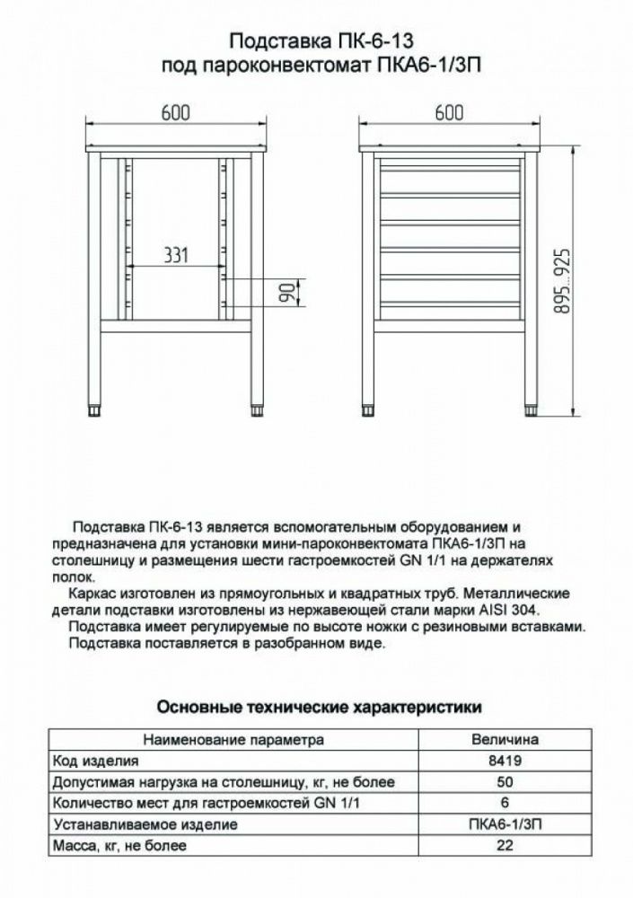 Подставка Abat ПК-6-13 (11000008419) для установки пароконвектоматов ПКА 6-1/3П. 6 направляющих GN 1/1 (530х325), материал - нерж.сталь AISI 304.
