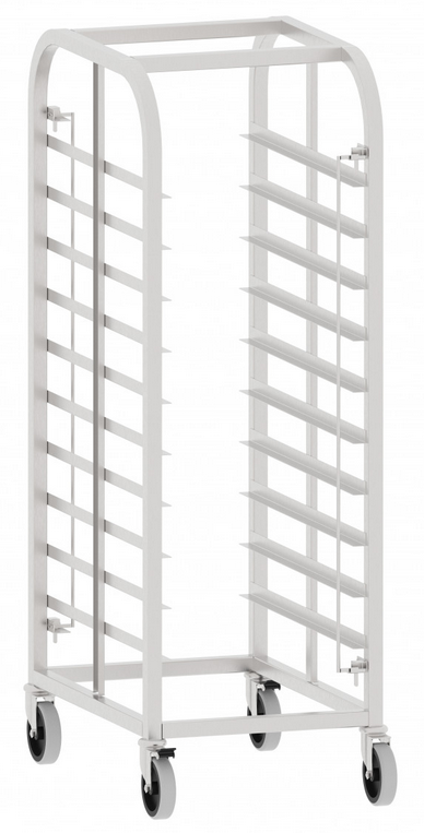 Тележка-шпилька ТШГ-10-1/1 является вспомогательным оборудованием для на предприятиях общественного питания работающих с тепловым оборудованием (пароконвектоматы, конфекционные печи) стандарта GN2/1. Тележка ТШГ-10-1/1 используется для транспортировки и хранения гастроемкостей с заготовками или готовым продуктом. 10 уровней направляющих для гастроемкостей стандарта GN1/1 позволяют загружать в тележку 10 гастроемкостей GN1/1 (530х325 мм) или 20 (по 2 шт на каждый уровень) гастреомкостей стандарта GN1/2 (325х265 мм).