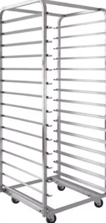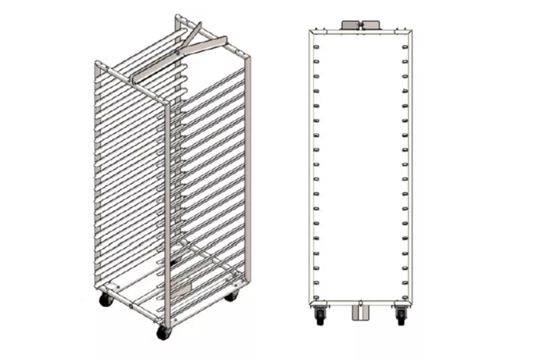 Тележка оснащена 4 термостойкими колёсами диаметром 100 мм, два из которых имеют тормоза. Это обеспечивает: лёгкость перемещения даже при полной загрузке, возможность фиксации на месте во время загрузки/выгрузки противней, устойчивость к высоким температурам в условиях пекарни.