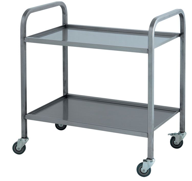 Тележка сервированная Атеси ТС-2/800. Материал – нержавеющая сталь марки AISI 304. Конструкция сварная. Каркас тележки выполнен из трубы квадратного сечения 25х25 мм. Полки размером 750х500 мм имеют по периметру бортик 15 мм. Все края имеют двойной подгиб для исключения травматизма. Тележка снабжена четырьмя колесами диаметром 75 мм, одно из которых оснащено тормозом.