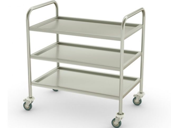 Тележка сервировочная Атеси ТС-3-Э с 3 полками предназначена для перемещения на предприятиях общественного питания по залу продуктов, готовых блюд, напитков и посуды, а также для подачи грязной посуды из зала в моечное отделение. Тележка имеет разборный каркас, выполненный из пищевой нержавеющей стали AISI 430, полки, выполненные из пищевой нержавеющей листовой стали и четыре колеса D100мм. Два колеса снабжены стопорным (тормозным) устройством, предотвращающим нежелательное перемещение тележки. Материал стоек – нержавеющая сталь AISI 340, труба диаметром 25 мм.